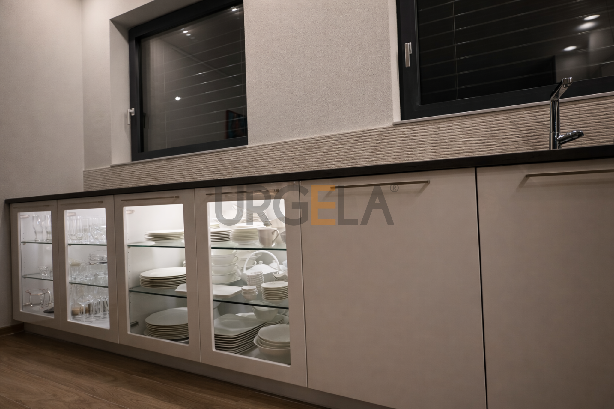 Ukážka praktických úložných systémov nábytku na mieru v kuchyni. Presklené dvierka spodných skriniek vyrobené presne podľa požiadaviek klienta. Samozrejme, nasvietené moderným LED osvetlením.