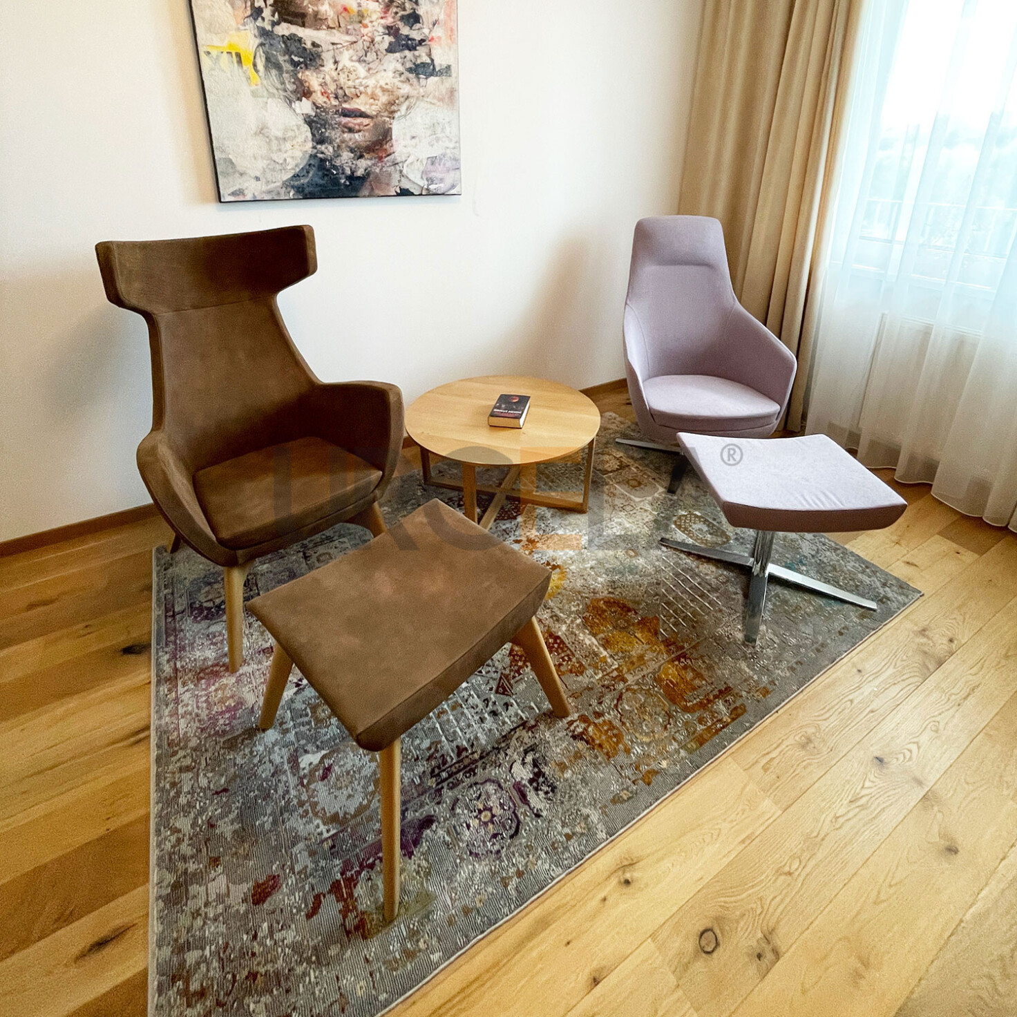 Krásny dizajnový obklad stien a policový systém na mieru doplnený o unikátne kreslá a vinotéku. Oddychová zóna pre dvoch, ktorú upevňuje teplo dreveného nábytku. Nadčasovosť dopĺňajú antracitové lakované časti.